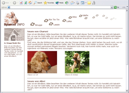 Leider habe ich kein Originalbild mehr, aber dies zeigt den allerersten Seitenentwurf für „Spaniel-Info.de“ wie die Seite damals hieß. 😀 (hier noch mit Blindtext und Fantasienbezeichnungen für die Navigation)